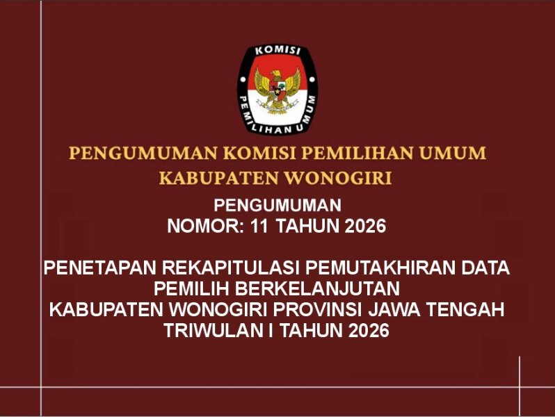 Pengumuman Penetapan Rekapitulasi Pemutakhiran Data Pemilih Berkelanjutan Kabupaten Wonogiri Provinsi Jawa Tengah Triwulan I Tahun 2026