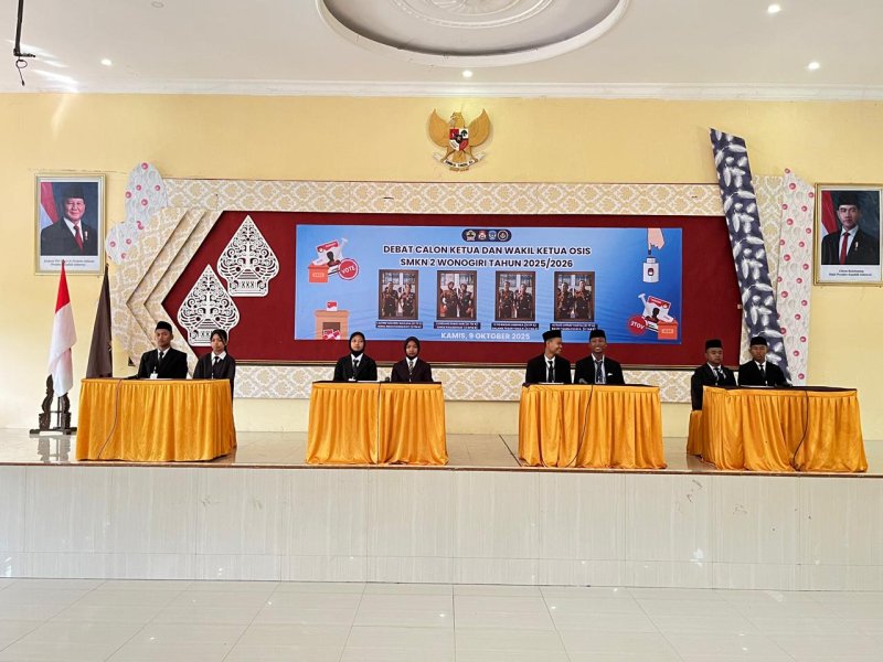Wonogiri — Suasana semarak dan penuh antusiasme mewarnai kegiatan Kampanye dan Debat Calon Ketua OSIS SMKN 2 Wonogiri yang digelar pada Kamis, 9 Oktober 2025. Kegiatan yang berlangsung sejak pukul 07.00 hingga 11.00 WIB ini dihadiri oleh Kepala Sekolah SMKN 2 Wonogiri, Para Wakil Kepala Sekolah, Anggota KPU Kabupaten Wonogiri, Anggota Bawaslu Kabupaten Wonogiri, serta seluruh siswa-siswi SMKN 2 Wonogiri.