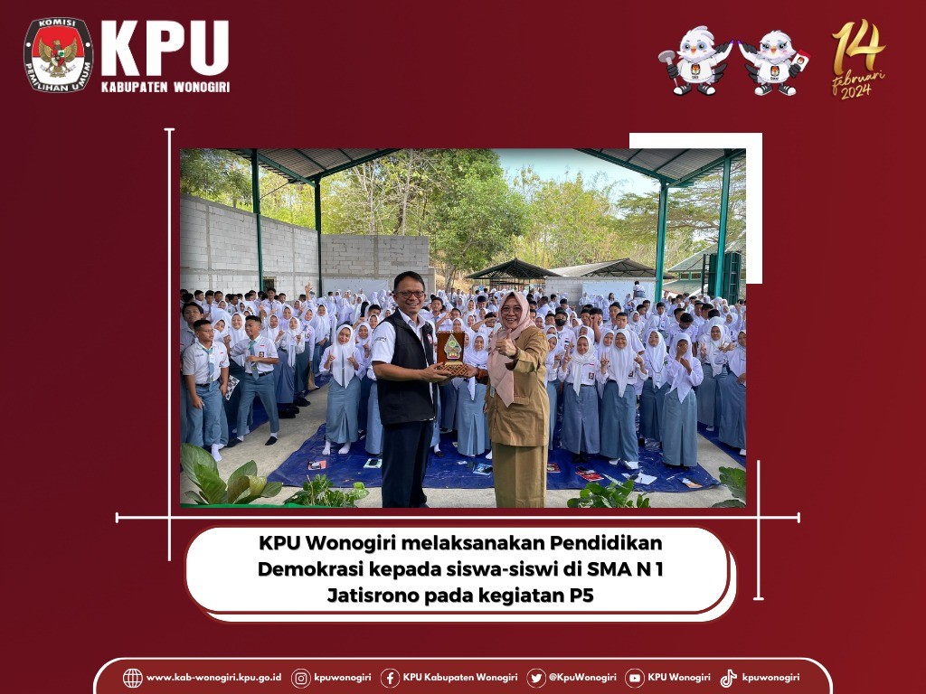Hari Senin 11 September 2023, KPU Wonogiri melaksanakan pendidikan demokrasi di SMA N 1 Jatisrono. Sosialisasi dilaksanakan dalam rangka pelaksanaan Projek Penguatan Profil Pelajar Pancasila (P5) serta untuk mempersiapkan penyelenggaraan Pemilihan Ketua Osis. Sosialisasi dilaksanakan dengan penyampaian materi, diskusi interaktif, dan simulasi pemungutan suara. ?