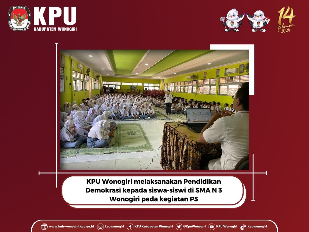 KPU Wonogiri melaksanakan pendidikan demokrasi di SMA N 3 Wonogiri pada Hari Senin tanggal 18 September 2023. Sosialisasi dilaksanakan dalam rangka pelaksanaan Projek Penguatan Profil Pelajar Pancasila (P5) serta untuk mengenalkan teknis penyelenggaraan pemungutan suara kepada siswa dan siswi kelas 11.