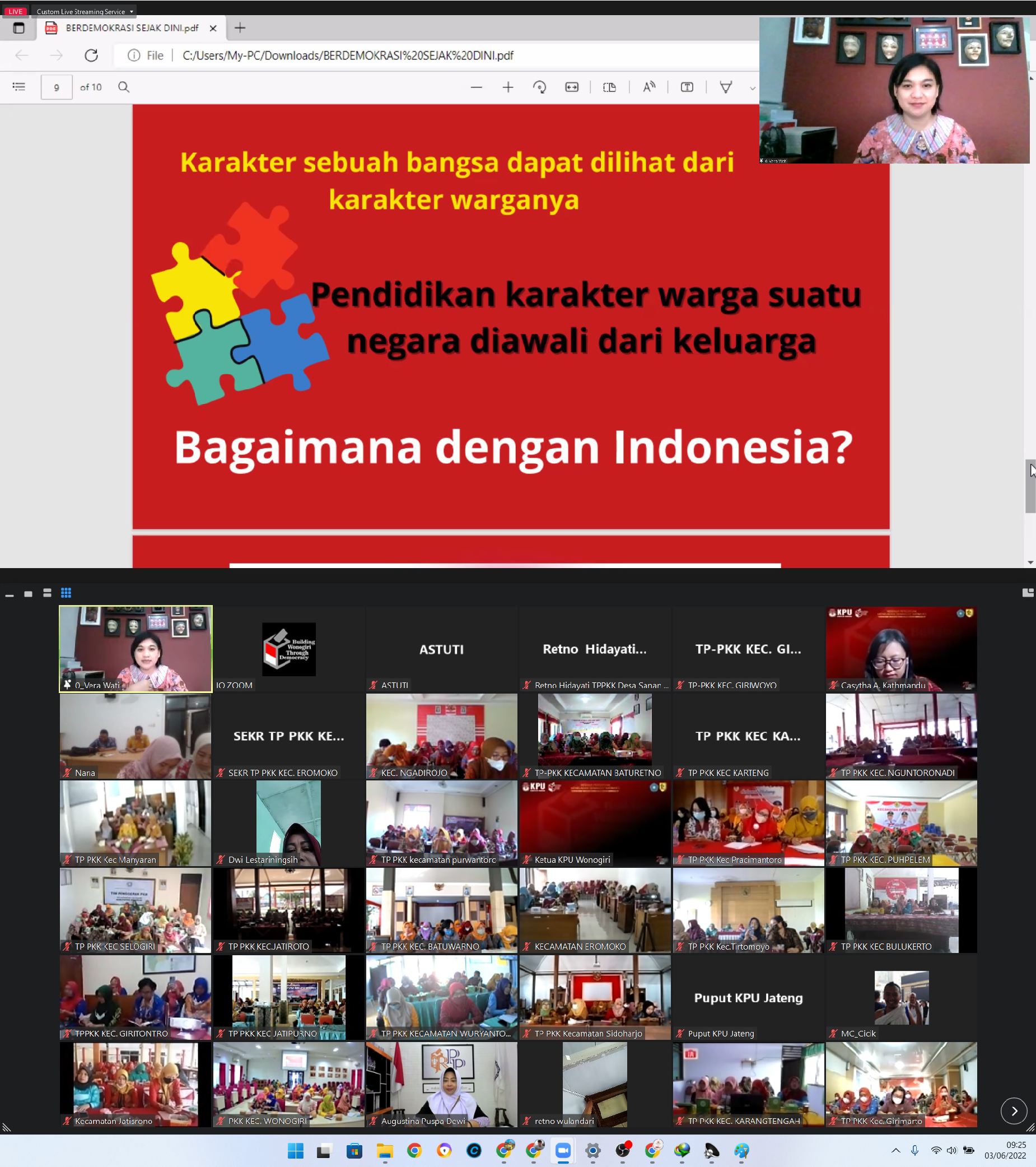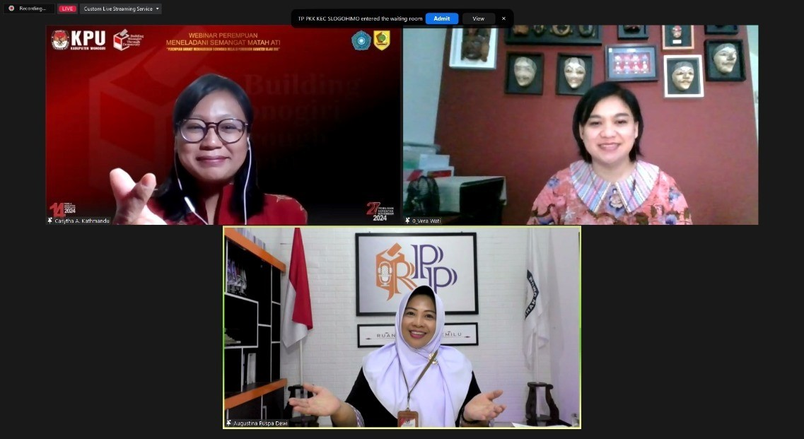"Terhadap politik tidak suka boleh, tidak peduli jangan", Casytha A. Kathmandu, S.E., M.Fin, Anggota DPD RI ketika menjadi narasumber di acara Webinar Civic Education Segment Perempuan yang di selenggarakan oleh KPU Kabupaten Wonogiri pada Hari Jumat, 3 Juni 2022 bersama drh. Verawati Joko Sutopo, M.Sc. Dalam webinar yang diikuti ibu-ibu PKK se-Kabupaten Wonogiri serta masyarakat umum tersebut Casytha menyayangkan budaya yang ada di masyarakat saat ini masih belum sepenuhnya mendukung peran perempuan untuk turut berpartisipasi. Pada masyarakat yang sudah semakin maju ini, masih banyak ditemukan anggapan bahwa perempuan urusannya cukup di dapur, sumur, kasur sehingga tidak perlu ikut memikirkan negara atau politik. Stigma itu terjadi karena terdapat ketimpangan paradigma peran perempuan dalam urusan kenegaraan. Meskipun demikian secara konstitusi sebenernya hak perempuan dan laki-laki untuk berpolitik sudah berimbang yang memungkinkan perempuan berpartisipasi secara langsung ataupun tidak langsung membangun negeri melalui politik. Dalam politik praktis terdapat banyak cara untuk berpartisipasi mulai dari menjadi peserta pemilu, penyelenggara pemilu, pengawas/pemantau pemilu, hingga turut serta menjadi pemilih pada pemilu. Di Wonogiri sendiri melalui Pemilu 2019, dari 50 caleg terpilih hanya terdapat 8 caleg terpilih perempuan. Walaupun masih sedikit, jumlah tersebut sudah mengalami peningkatan dibanding periode 2014-2019 yang hanya terdapat 4 caleg terpilih perempuan. Selain secara langsung, perempuan juga dapat berpartisipasi secara tidak langsung dalam usaha membangun negeri, salah satu caranya yakni melalui pendidikan karakter pada anak. Perempuan sebagai ibu memiliki peran sentral sebagai guru karakter yang memberikan penanaman mindset pada anak dengan memberikan contoh melalui tindakan-tindakan yang mencerminkan sikap demokratis, misalnya dengan menghargai keputusan anak. Walaupun pada akhirnya keputusan tersebut tidak berhasil, ibu tetap harus membiarkan anak untuk belajar dan terus memberikan motivasi agar dapat kembali bangkit. Dengan mengalami berbagai kegagalan anak dapat membentuk ketangguhan diri terhadap faktor eksternal yang kemudian dapat menumbuhkan kepekaan sosial mengenai pentingnya suatu keputusan seseorang bagi orang itu sendiri sehingga dia tumbuh menjadi anak yang dapat menghargai keputusan orang lain serta menghormati setiap perbedaan. Selain contoh-contoh itu, tentu masih banyak peran-peran yang dapat dilakukan oleh perempuan untuk membangun kehidupan demokrasi di negeri ini baik di tataran lokal ataupun nasional. Tapi yang jelas tidak ada demokrasi tanpa perempuan serta tidak ada demokrasi yang bermartabat tanpa keterlibatan perempuan. (PJK/Red)