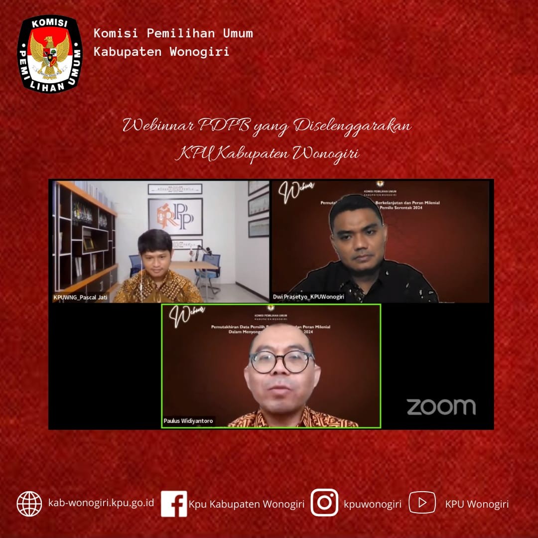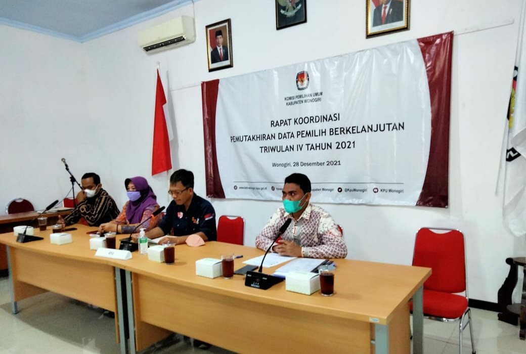 Wonogiri-Selasa, 28 Desember 2021 KPU Kabupaten Wonogiri kembali menggelar rapat koordinasi Pemutakhiran Data Pemilih Berkelanjutan (DPB) Triwulan IV Tahun 2021 bertempat di aula KPU Kabupaten Wonogiri yang dihadiri oleh Polres Wonogiri, Kodim 0728 Wonogiri, Dinas Kependudukan dan Catatan Sipil Wonogiri, Bawaslu Kabupaten Wonogiri. Dari pihak KPU Kabupaten Wonogiri turut hadir pula Ketua beserta anggota, Sekretaris, Kasubbag beserta staff sekretariat KPU Kabupaten Wonogiri. Pemutakhiran Data Pemilih Berkelanjutan merupakan kegiatan untuk memperbaharui Data Pemilih berdasarkan Daftar Pemilih Tetap dari Pemilu atau Pemilihan terakhir dan telah disinkronisasikan dengan data kependudukan secara nasional. Rekapitulasi Daftar Pemilih Berkelanjutan di Kabupaten Wonogiri pada (DPB) Triwulan IV Tahun 2021 adalah sejumlah 838. 087 (delapan ratus tiga puluh delapan ribu delapan puluh tujuh), pemilih laki-laki sejumlah 415.205 (empat ratus lima belas ribu dua ratus lima) orang, pemilih perempuan sejumlah 422.882 (empat ratus dua puluh dua ribu delapan ratus delapan puluh dua) orang. Masyarakat dapat turut aktif dalam kegiatan Pemutakhiran Data Pemilih Berkelanjutan dengan melaporkan data mandiri dan/atau data orang lain ke KPU Kabupaten Wonogiri via online dengan mengisi formulir online melalui link yang disediakan. Mengakses form online di website KPU Kabupaten Wonogiri pada menu link DPB atau akses langsung di link http://bit.ly/pdpbwonogiri kemudian mengisi form tanggapan masyarakat disertai unggah data bukti pendukung Via offline masyarakat dapat datang langsung ke Kantor KPU Kabupaten Wonogiri. Mengisi form tanggapan masyarakat yang dapat di download di website KPU Kabupaten Wonogiri www.kab-wonogiri.kpu.go.id, disertai bukti pendukung.