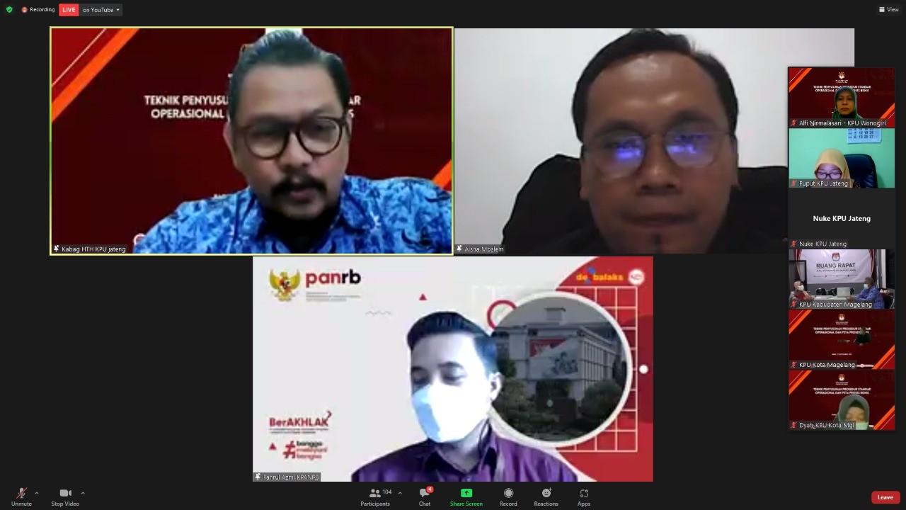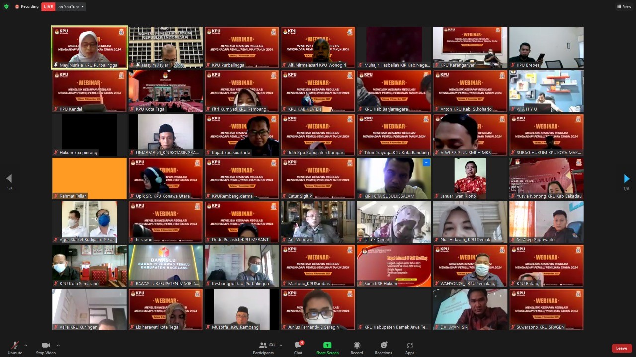 Wonogiri – Selasa (09/11) KPU Kabupaten Wonogiri mengikuti webinar Menelisik Kesiapan Regulasi Menghadapi Pemilu/Pemilihan Tahun 2024 yang diselenggarakan oleh KPU Kabupaten Purbalingga dengan narasumber Anggota KPU RI Hasyim Asy’ari, SH, M.Si, Ph.D, Anggota DPR RI Komisi II Arif Wibowo, SH, dan Dekan Fakultas Hukum Unsoed Prof. Dr. M. Fauzan serta moderator dari Anggota KPU Kabupaten Purbalingga Mey Nurlela, SS, M.Si. Webinar diikuti oleh Ketua, Anggota, Sekretaris, dan Kasubbag Hukum KPU Kabupaten Wonogiri.