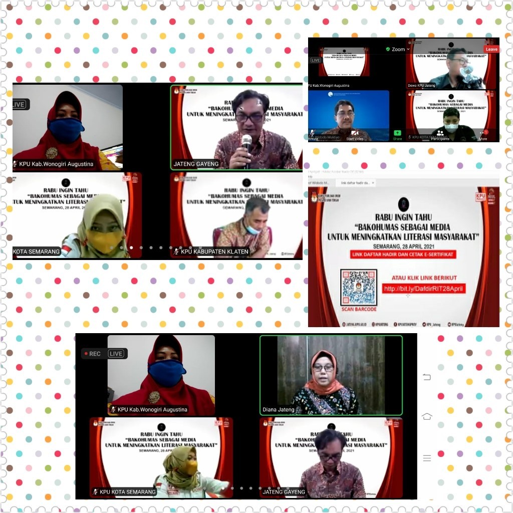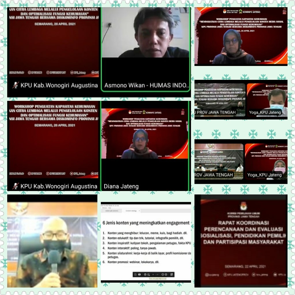 Wonogiri, kab-wonogiri.kpu.go.id, Komisi Pemilihan Umum (KPU) Kabupaten Wonogiri Divisi Sosialisasi Pendidikan Pemilih, Partisipasi Masyarakat dan Sumber Daya Manusia Augustina Puspa Dewi beserta Kasubag Teknis dan Hupmas Tri Sujarwati mengikuti Workshop Penguatan Kapasitas Kehumasan “Meningkatkan Citra Lembaga Melalui Pengelolaan Konten Media Sosial dan Optimalisasi Fungsi Kehumasan” yang diselenggarakan KPU Provinsi Jawa Tengah (Jateng), Senin (26/04/2021). Kegiatan peningkatan kapasitas lembaga dan peran kehumasan ini selain diikuti oleh KPU Kabupaten/Kota se Jawa Tengah juga diikuti oleh Kominfo Kabupaten/Kota se-Jawa Tengah. Dalam acara Workshop ini menghadirkan dua narasumber yaitu Asmono Wikan Founder Humas Indonesia.id dan Wicaksono (@ndorokakung) Digital Creator. Dimoderatori oleh Dimas D. Narottama Sub Koordinator Subbag Teknis dan Hupmas KPU Provinsi Jawa Tengah. Acara dibuka dengan sambutan dari Kepala Dinas Kominfo Jawa Tengah yang diwakili Kepala Bidang Informasi dan Komunikasi Publik, Agung Kristianto. Asmono Wikan, sebagai narasumber pertama menyampaikan bahwa “seorang public relation mempunyai posisi strategis dalam proses komunikasi selain itu, Asmono juga menjelaskan pentingnya peran kehumasan dalam membangun citra dan reputasi lembaga. Humas mempunyai peran yang strategis dalam suatu instansi ataupun organisasi, sehingga fungsi-fungsi Humas harus dioptimalkan. Posisi Humas berada diantara organisasi dan publik, karena itu Humas memiliki peran strategis, tidak cukup dengan berkomunikasi biasa tapi harus mampu mengemas cerita atau mendongeng karena berdampak pada perubahan perilaku masyarakat,” ujarnya. Ia juga menyampaikan bahwa kerja humas ditentukan dengan cara berkomunikasi yang baik dengan publik.Di akhir sesi, Asmono mengingatkan agar semua lembaga dapat memanfaatkan momentum dengan baik untuk menunjukkan keberadaan lembaga tersebut. Sementara itu, narasumber kedua, Wicaksono menyampaikan beberapa strategi terkait optimalisasi konten termasuk memberikan bocoran konten apa saja yang dapat dilakukan oleh sebuah lembaga untuk menarik endorsement. Kesimpulan dari acara ini diharapkan melalui workshop ini dapat meningkatkan kapasitas kehumasan melalui pengelolaan konten media sosial dan dapat melaksanakan fungsi kehumasan secara optimal sehingga bisa menciptakan persepsi positif publik tentang organisasi.