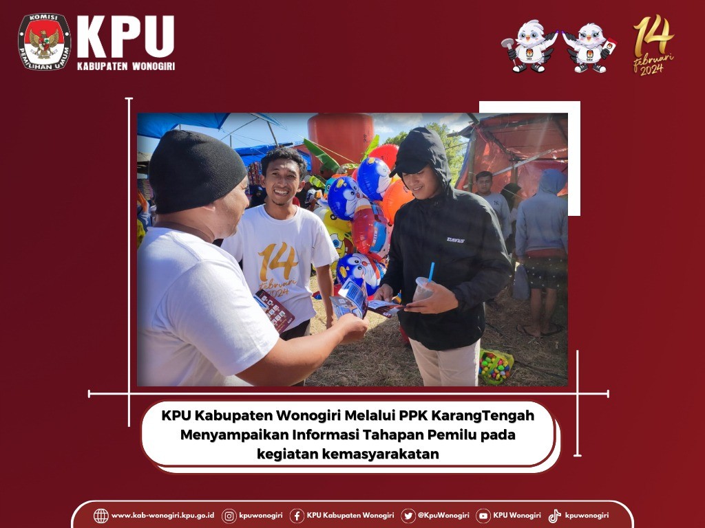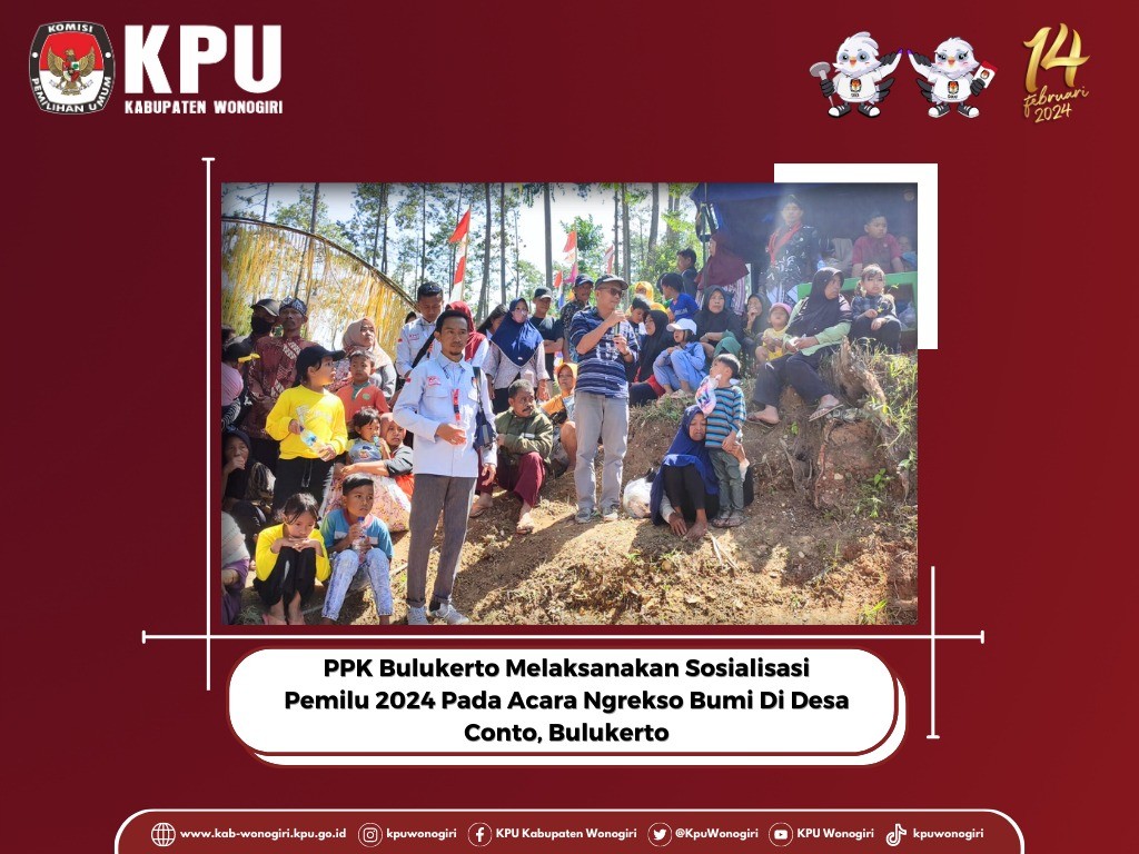 Pada Hari Minggu, 23 Juli 2023, PPK Bulukerto melaksanakan sosialisasi Pemilu Serentak Tahun 2024 pada kegiatan Ngrekso Bumi di Desa Conto, Bulukerto. Turut bergabung dalam pelaksanaan sosialisasi tersebut, Bapak Toto Sihsetyo Adi, Selaku Ketua KPU Wonogiri.