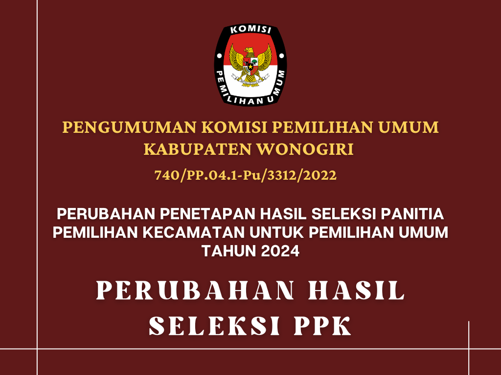 Pengumuman Perubahan Penetapan Hasil Seleksi PPK Pemilu Tahun 2024 Selasa, 03 Januari 2023 08:00 744 Pengumuman Perubahan Penetapan Hasil Seleksi PPK Pemilu Tahun 2024 Baca Selengkapnya