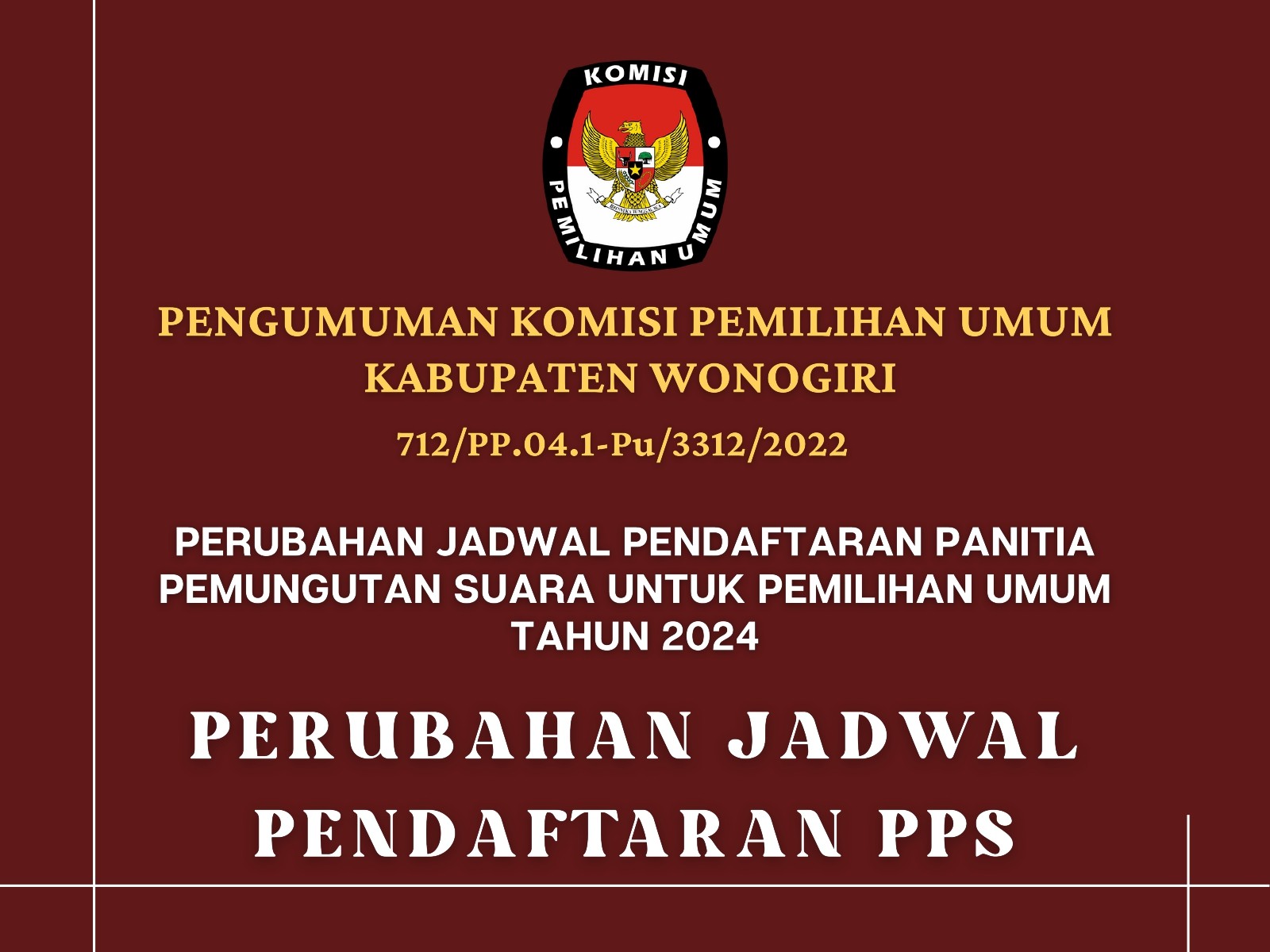 Pengumuman Perubahan Jadwal Pendaftaran Panitia Pemungutan Suara Tahun 2024 Jumat, 23 Desember 2022 18:00 485 Pengumuman Perubahan Jadwal PPS Baca Selengkapnya