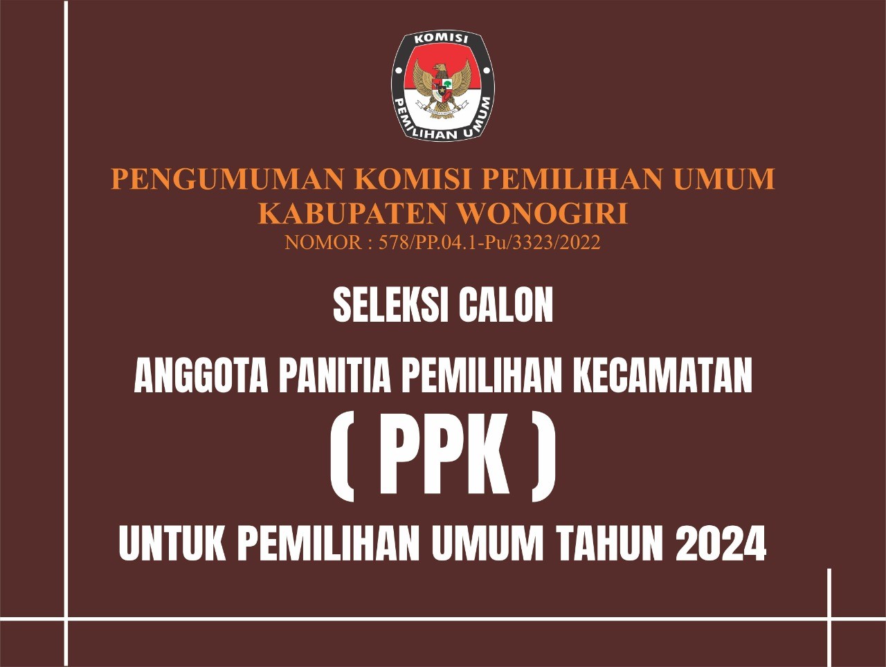 PENGUMUMAN SELEKSI CALON ANGGOTA PANITIA PEMILIHAN KECAMATAN (PPK) UNTUK PEMILIHAN UMUM TAHUN 2024 Minggu, 20 November 2022 00:00 2934 No Nama File Download 1 Pengumuman Pendaftaran PPK 2 Surat Pendaftaran PPK 3 Surat Pernyataan PPK 4 Lampiran DRH Baca Selengkapnya