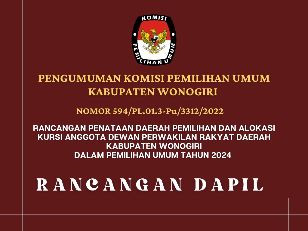 Pengumuman Rancangan Penataan DAPIL dan Alokasi Kursi Anggota DPRD Kabupaten Wonogiri Tahun 2024 Rabu, 23 November 2022 21:00 1019 Pengumuman Rancangan Penataan DAPIL dan Alokasi Kursi Anggota DPRD Kab.Wonogiri Tahun 2024 Baca Selengkapnya