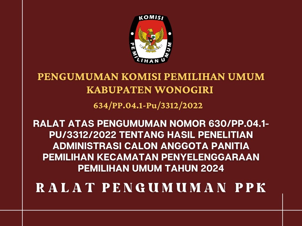 Ralat Atas Pengumuman Nomor 630/PP.04.1-PU/3312/2022 tentang Hasil Penelitian Administrasi Calon Anggota PPK Pemilu Tahun 2024 Senin, 05 Desember 2022 17:00 799 Ralat Pengumuman Hasil Penelitian Administrasi Calon Anggota PPK Pemilu Tahun 2024 Baca Selengkapnya