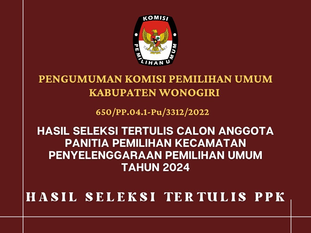 Hasil Seleksi Tertulis calon Anggota Penitia Pemilihan Kecamatan (PPK) Pemilu Tahun 2024 Kamis, 08 Desember 2022 12:00 1067 Pengumuman Hasil Tertulis Calon Anggota PPK Pemilu Tahun 2024 Baca Selengkapnya