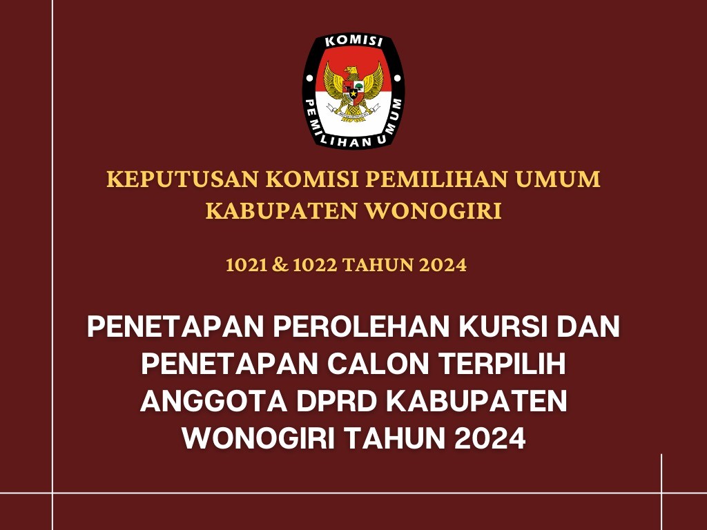 Penetapan Perolehan Kursi Dan Penetapan Calon Terpilih Anggota DPRD Kabupaten Wonogiri Tahun 2024 Jumat, 03 Mei 2024 23:59 657 1. PENETAPAN PEROLEHAN KURSI DAN PENETAPAN CALON TERPILIH ANGGOTA DPRD KABUPATEN WONOGIRI TAHUN 2024 Baca Selengkapnya