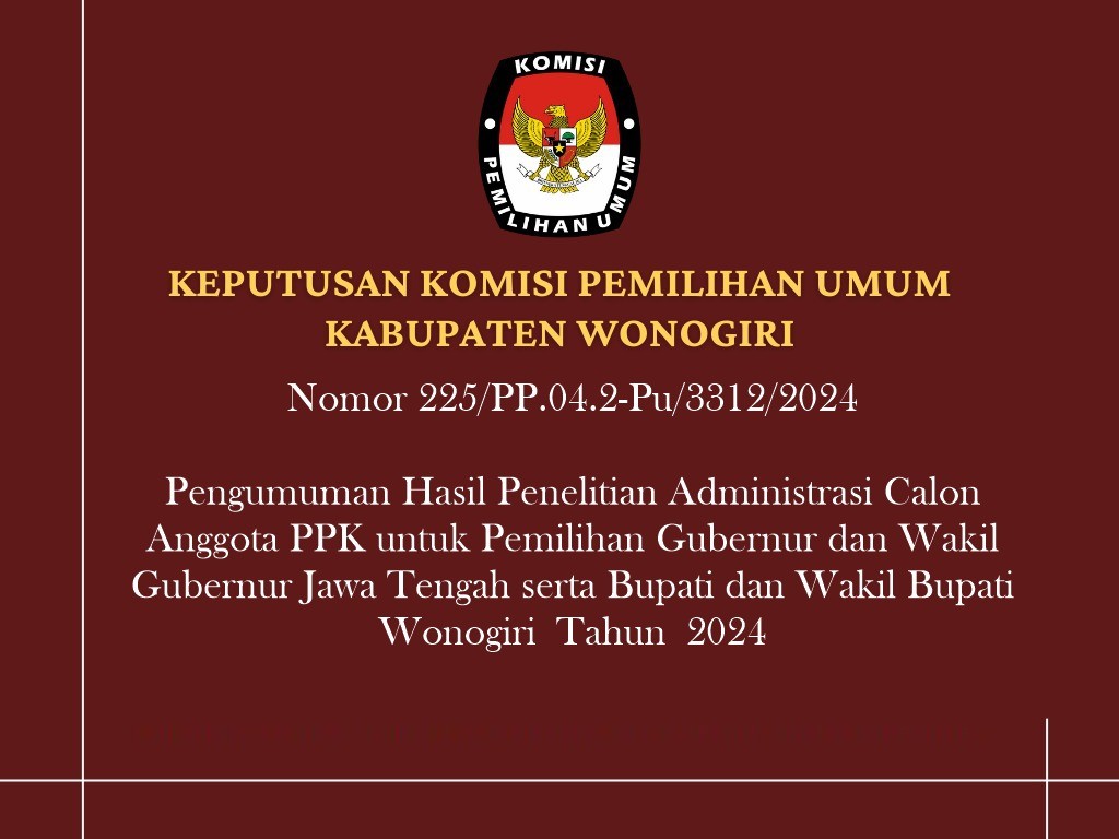 Pengumuman Hasil Penelitian Administrasi Calon Anggota PPK untuk Pemilihan Gubernur dan Wakil Gubernur Jawa Tengah serta Bupati dan Wakil Bupati Wonogiri Tahun 2024 Sabtu, 04 Mei 2024 07:00 921 1. Nomor 225/PP.04.2-Pu/3312/2024 Baca Selengkapnya