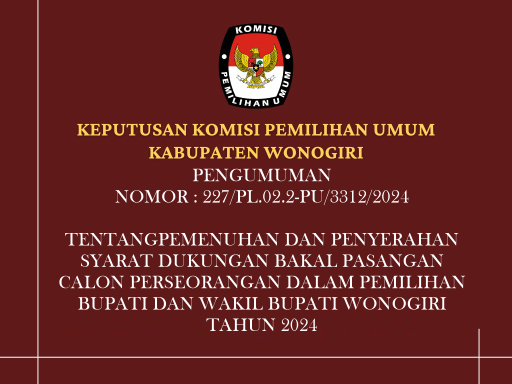 Pengumuman Pemenuhan Dan Penyerahan Syarat Dukungan Bakal Pasangan Calon Perseorangan Dalam Pemilihan Bupati Dan Wakil Bupati Wonogiri Tahun 2024 Minggu, 05 Mei 2024 00:00 621 1. 227/PL.02.2-PU/3312/2024 Baca Selengkapnya