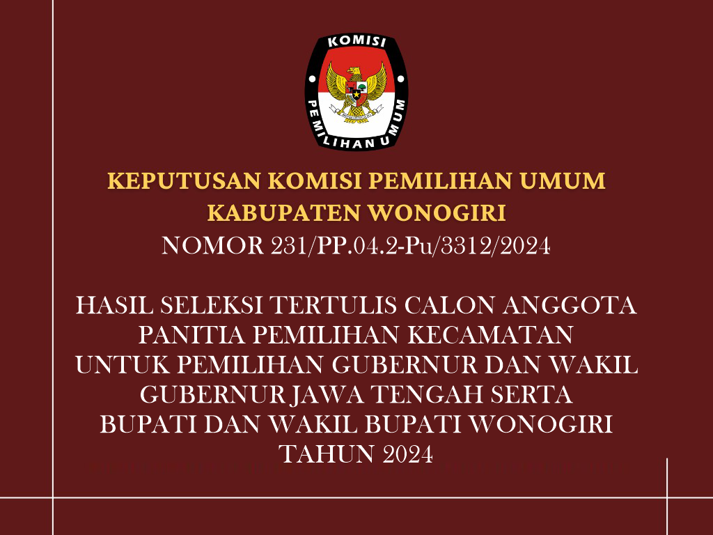Pengumuman Hasil Seleksi Tertulis Calon Anggota Panitia Pemilihan Kecamatan Untuk Pemilihan Gubernur Dan Wakil Gubernur Jawa Tengah Serta Bupati Dan Wakil Bupati Wonogiri Tahun 2024 Kamis, 09 Mei 2024 07:00 855 1. NOMOR 231/PP.04.2-Pu/3312/2024 Baca Selengkapnya