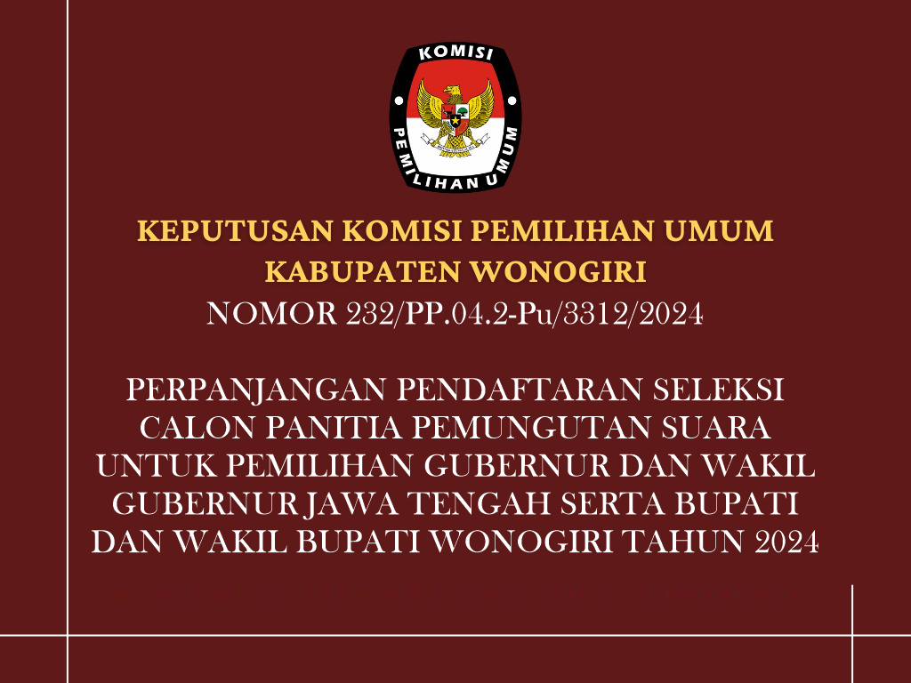 Pengumuman Perpanjangan Pendaftaran Seleksi Calon Panitia Pemungutan Suara Untuk Pemilihan Gubernur Dan Wakil Gubernur Jawa Tengah Serta Bupati Dan Wakil Bupati Wonogiri Tahun 2024 Kamis, 09 Mei 2024 00:01 1502 1. 232/PL.04.2-PU/3312/2024 Baca Selengkapnya