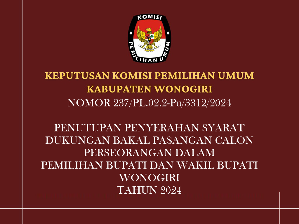 Penutupan Penyerahan Syarat Dukungan Bakal Pasangan Calon Perseorangan Dalam Pemilihan Bupati Dan Wakil Bupati Wonogiri Tahun 2024 Senin, 13 Mei 2024 23:59 630 1. NOMOR 237/PL.02.2-Pu/3312/2024 Baca Selengkapnya