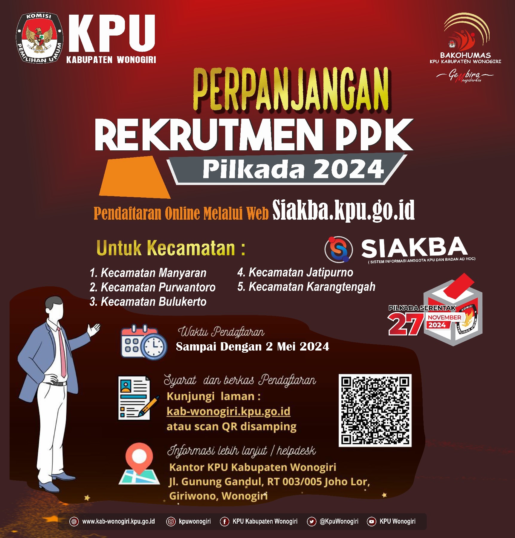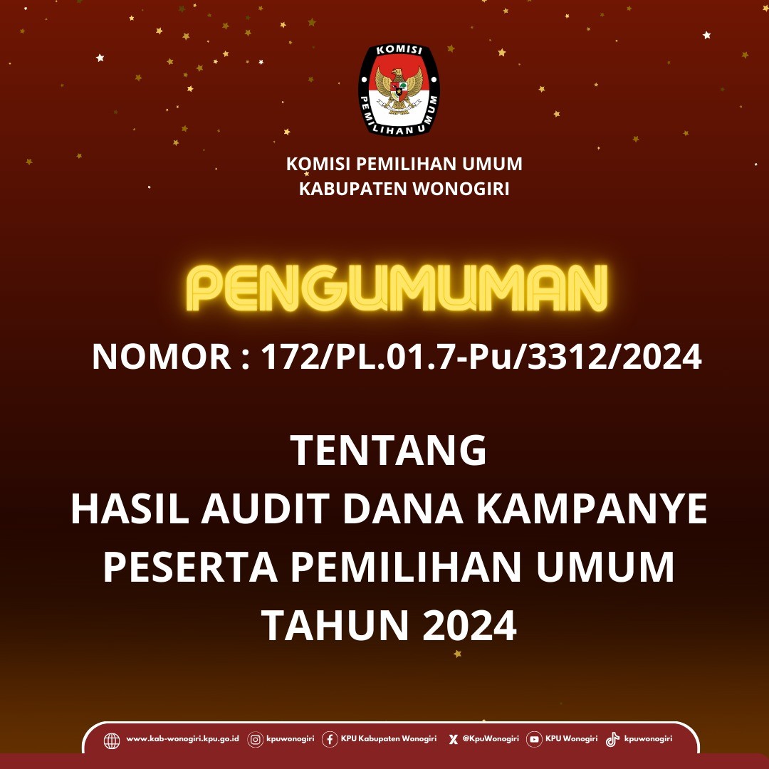 Dalam rangka menyongsong penyelenggaraan Pemilihan Bupati dan Wakil Bupati Wonogiri Tahun 2024 serta untuk menumbuhkan dan mengangkat potensi kearifan lokal sebagai upaya memperkaya kreasi sosialisasi, KPU Kabupaten Wonogiri menyelenggarakan Lomba Cipta Jingle dan Maskot Pemilihan Bupati dan Wakil Bupati Wonogiri Tahun 2024. Untuk informasi lebih lanjut klik link di bawah ini.